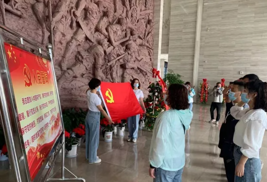 在莊嚴的紀(jì)念館序廳革命先輩浮雕前,全體黨員干部面對鮮紅的黨旗重溫了入黨誓詞。