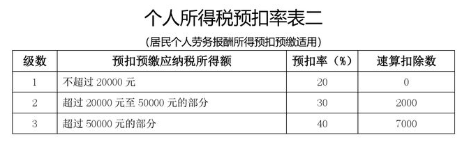 勞務(wù)報(bào)酬所得適用20%至40%的超額累進(jìn)預(yù)扣率(見《個人所得稅預(yù)扣率表二》)。